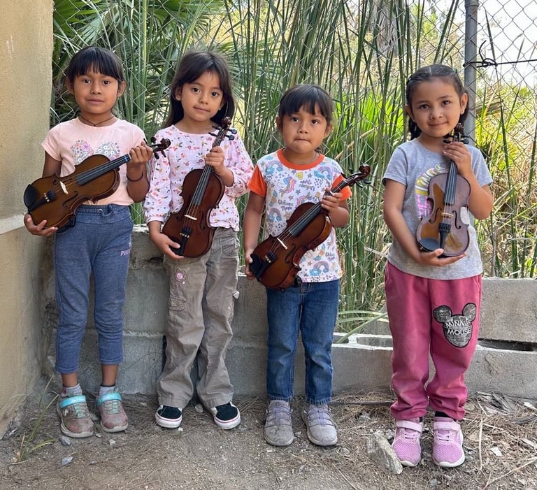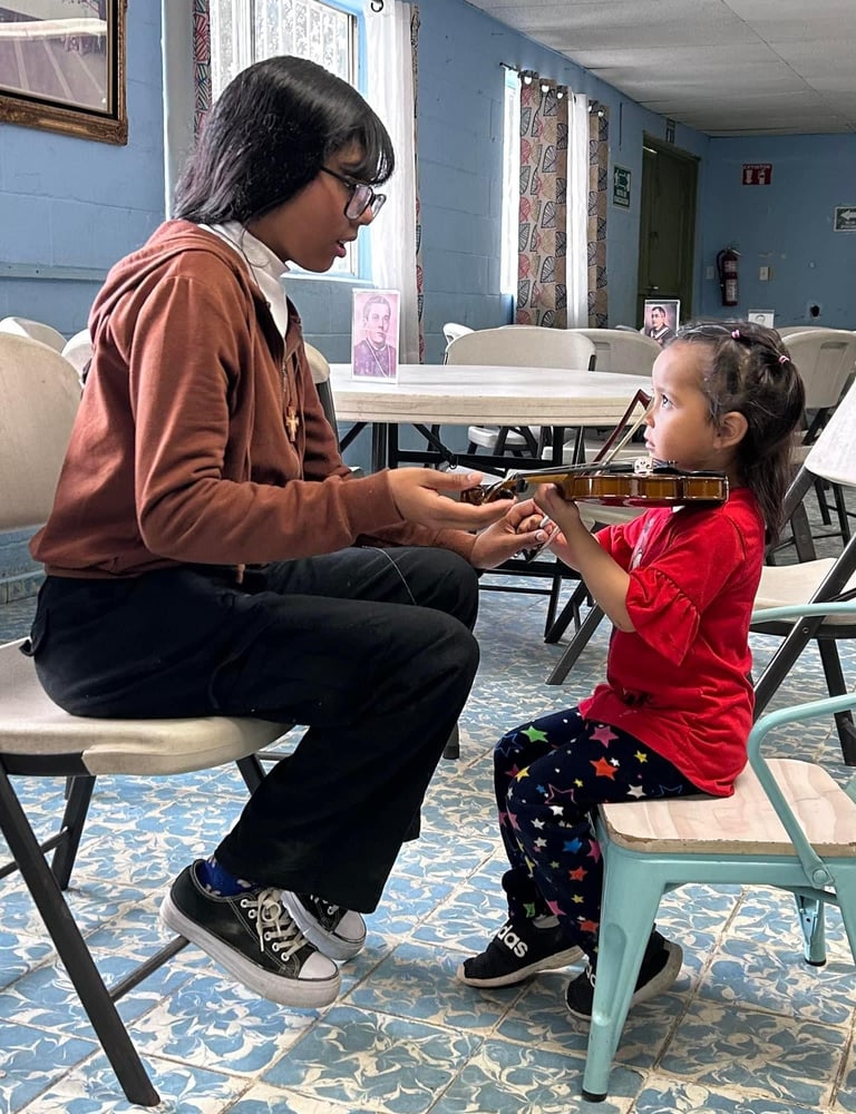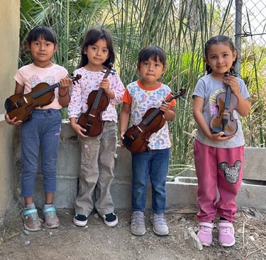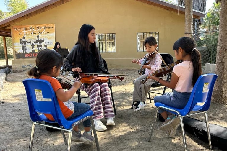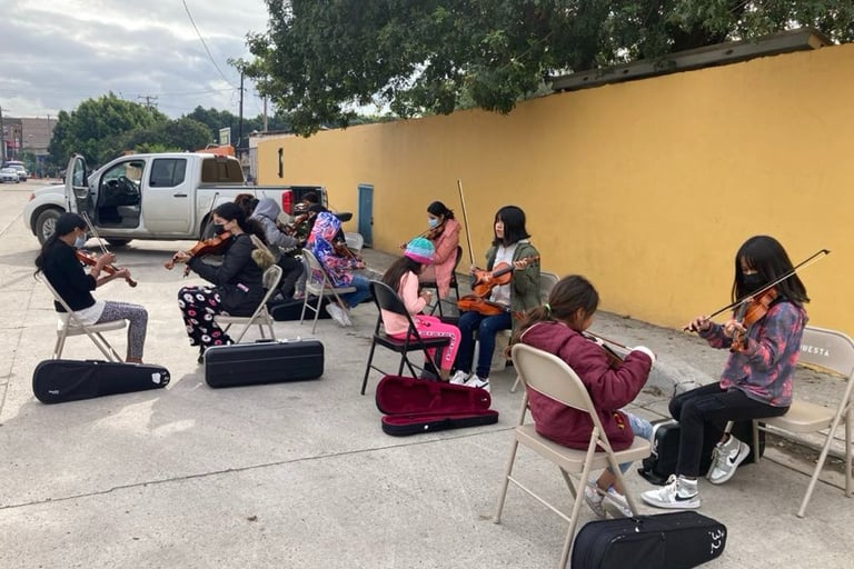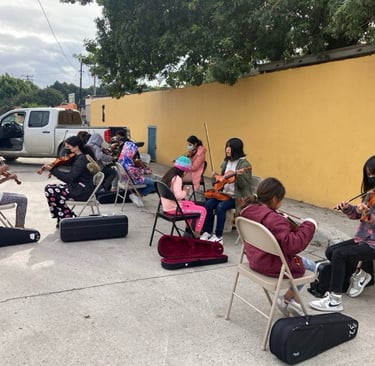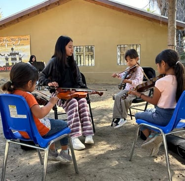 "Kids Empowering Kids" is a transformative program by Orquesta Guadalupana where seasoned members mentor beginner students in music lessons. Each 'student teacher' earns $5.00 USD per lesson, significantly more than the average daily wage of $2.00 per hour in Tijuana. This opportunity not only empowers orchestra members but also contributes to their family income.