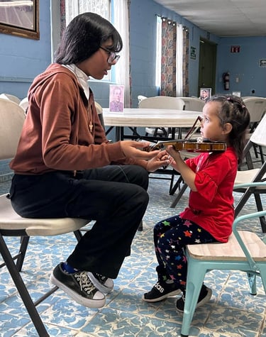 (Top) Orquesta Guadalupana member (left) giving a violin lesson to a beginner student